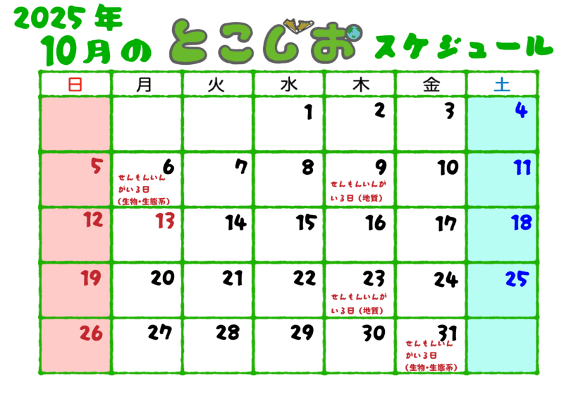 遅くなり申し訳ございません。10月の専門員常駐カレンダーです。