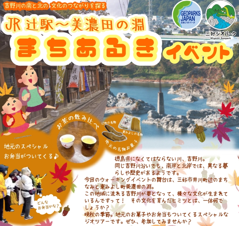 吉野川南岸の辻の町並みを散策し、吉野川を渡った北岸では景勝地、美濃田の淵を目指しながら、それぞれの文化を生んだ秘密を探っていきます。